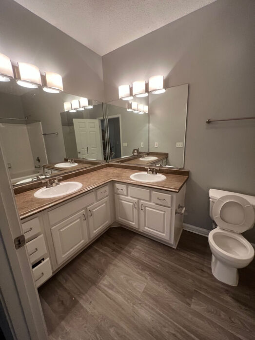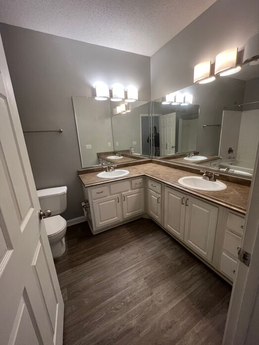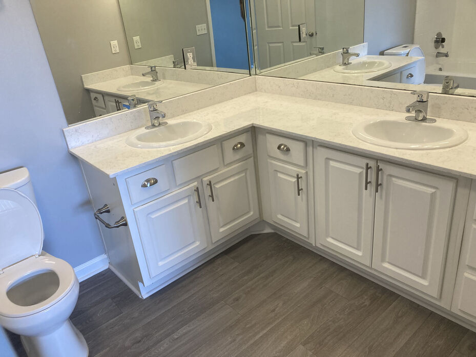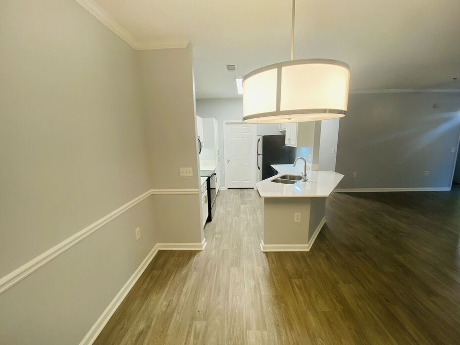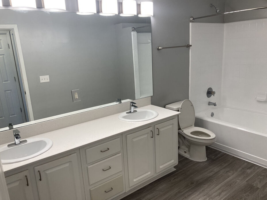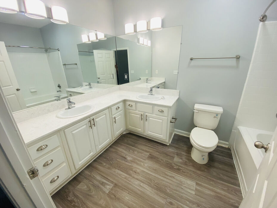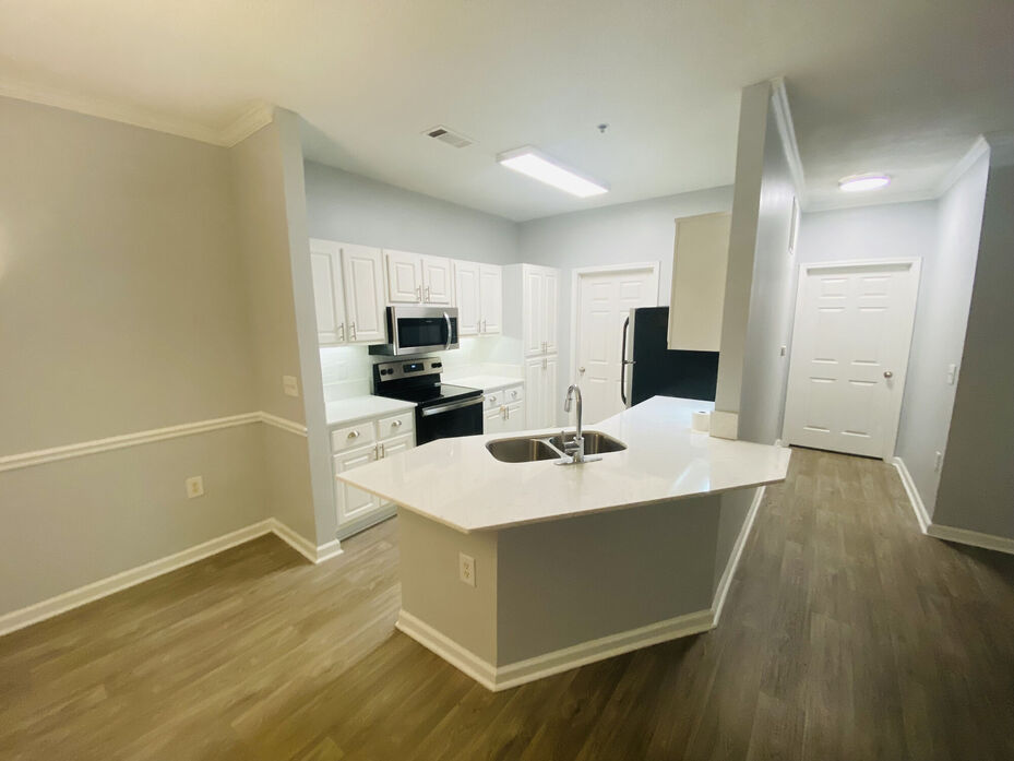 Bright, open apartment with a modern kitchen and island, wood‑style floors, spacious bedroom, walk‑in closets, and spa‑like baths with double vanities.