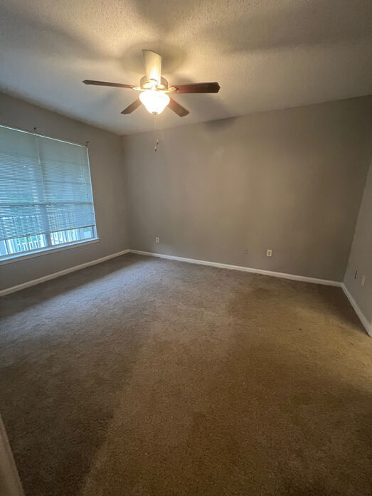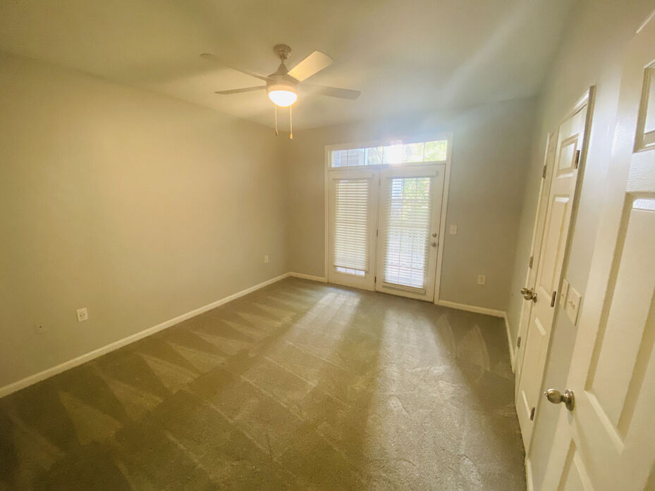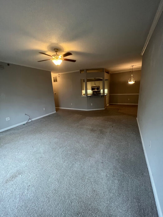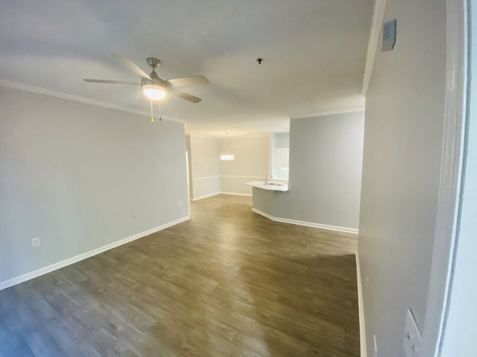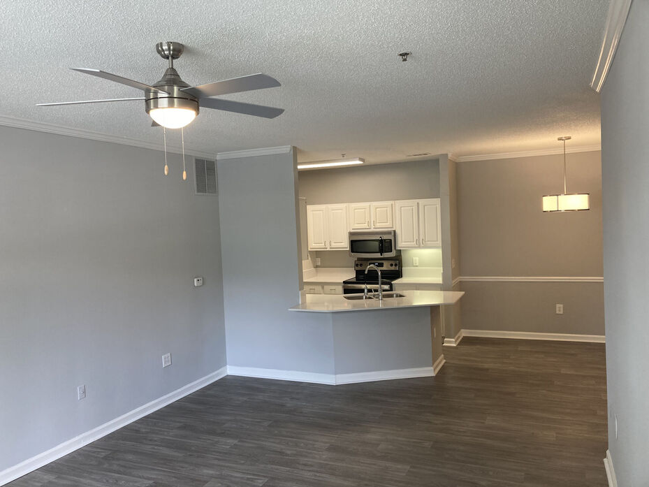 Spacious 1‑bedroom with open living area, modern kitchen and island, stainless appliances, plush carpet, ceiling fans, and a spa‑style bath with double vanity and soaking tub.